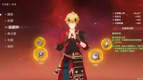 圣遗物武器部分,我个人认为目前并没有哪一套特别适配托马,可以采用2千岩2绝缘来提升护盾跟充能,或者四宗室当纯辅助。主词方面一般建议充生生,如果拿西风枪则可以考虑充生爆率来稳定触发西风被动,生生生的生命可以突破3万,不过相对充能憋屈,也许四命可以尝试看看。副词部分:生命%=充能%>爆率=固定生命