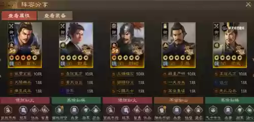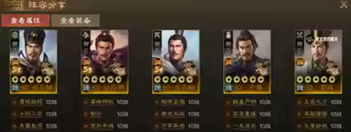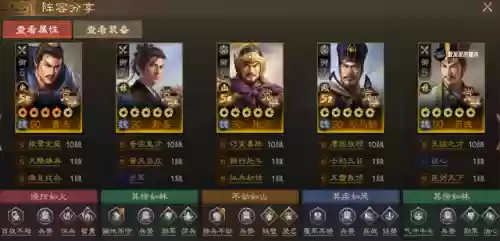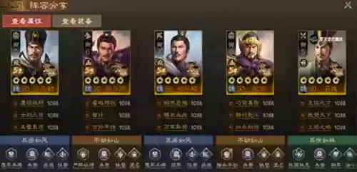而且郝昭作为一个文武武将,且自带类似匡弼天下的治疗,也是能作为一个召唤武将使用的。这里让郝昭带上了胡骑+心腹之士,至此五个召唤战法全用上了。而于禁则是携带一夫+高垒两光环,加上荀彧的先礼后兵,防御能力有保证。