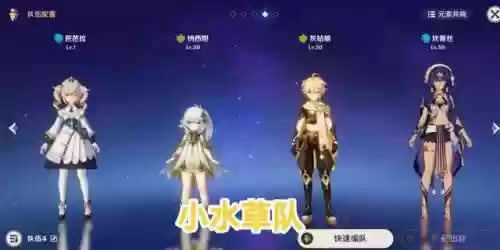 这支组队依然是围绕纳西妲进行搭配,由两个草元素、水元素组成,可以组成小水草队,利用草元素和水元素打出草种子,爆炸造成伤害。