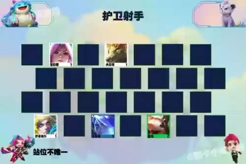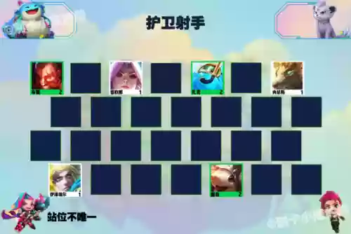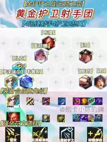 护卫射手的核心思路在于利用前期多张三星质量卡保证前中期的连胜质量,同时对于强化符文方面的需求也没有特定的需求,有相关的强化符文肯定是最好,但是通用类的符文也是可以保证我们前四的;其次大家需要明白的是护卫射手并不是一套吃鸡阵容,更多的偏向是于前四,能够拿到第二已经是非常厉害了,如果想要吃鸡还是需要更加强势的强化符文进行搭配