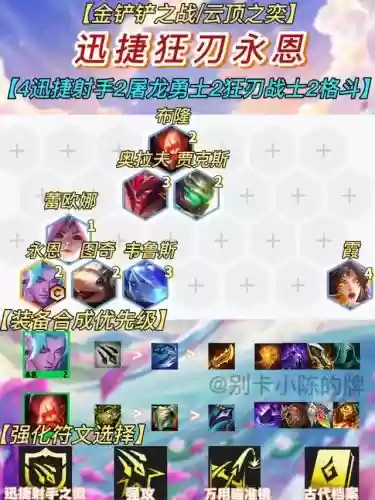 这套阵容针对在有迅捷射手转职的前提下进行阵容的变阵,迅捷狂刃永恩相信大家也不陌生了,优质的输出环境可以给与永恩更稳定的输出能力,因此在有迅捷射手转职的前提下大家可以优先考虑迅捷狂刃永恩这套阵容