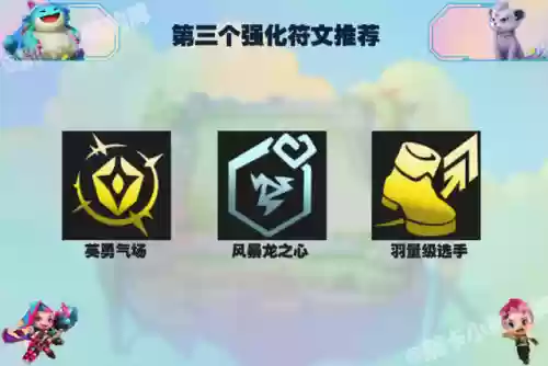剩余的强化符文在选择中并没有太多的限制,尽量往我们阵容相关的强化符文上进行选择即可,比如护卫相关的英勇气场,风暴龙相关的风暴龙之心等,其次推荐大家可以选择源计划类以及羽量级选手,因为阵容中大部分的单卡都是低费卡,羽量级选手可以很好的增加攻速以及移动速度