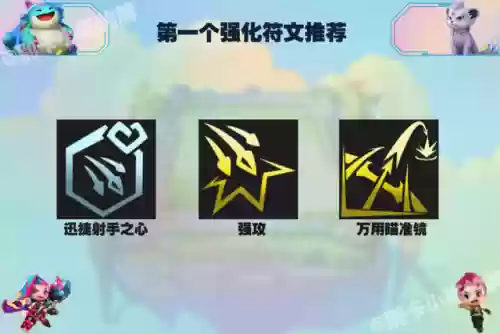 优先推荐大家选取迅捷射手相关的强化符文,不管是强攻还是迅捷射手之心/徽,都是非常有利于提高我们阵容上限的,其次可以选择万用瞄准镜进行提高迅捷射手们的攻击速度