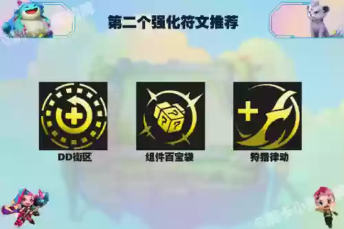 第二次的强化符文选择中我们尽量选择可以提供装备类的组件百宝袋,百宝袋等,或者可以选择提供阵容续航能力的狩猎律动,星界赐福等,因为在中期我们的输出能力会达到一个上限,我们要尽量保证阵容的持续输出能力和续航能力,其次就是选择提供经济类的DD街区,快速思考等能够帮助我们更快的搜到更多的三星质量卡