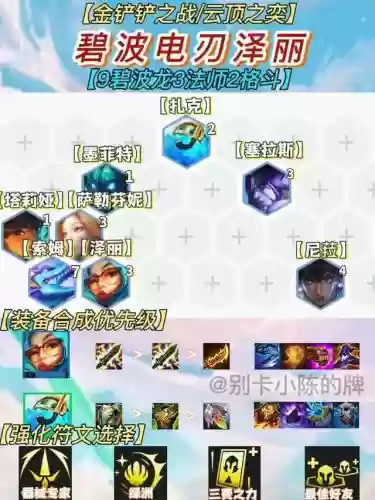 这套阵容针对在有器械专家的前提下进行阵容的变阵,首先我们前期是必备斯塔提克电刃,也就是说一旦我们选择了器械专家那么就有两个斯塔提克电刃的加持,同时搭配上碧波龙高额基础攻速和鬼索的狂暴之刃的成长攻速可以频繁触发斯塔提克电刃的魔法伤害