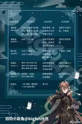 不依靠奶妈辅助,靠高输出碾压过图。由于此类阵型缺乏治疗,输出的选择上尽量选择生存能力较强的。