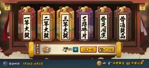 抽奖消耗高招卷,可以白嫖三次。抽三次保底兑换一片S级忍者碎片,抽中其他特殊奖项的概率很小,基本上90%是材料。