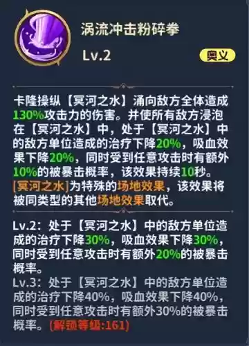 卡隆操纵冥河之水涌向地方全体造成130%攻击力的伤害。并使所有地方浸泡在冥河之水中,处于冥河之水中的地方单位造成的治疗下降20%,吸血效果下降20%,同时受到任意攻击时有额外10%的被暴击概率,该效果持续10秒。
