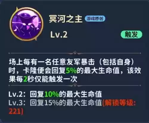 冥河之主,场上每有一名任意友军暴击(包括自身)时,卡隆便会回复5%的最大生命值,该效果每2秒仅能触发一次