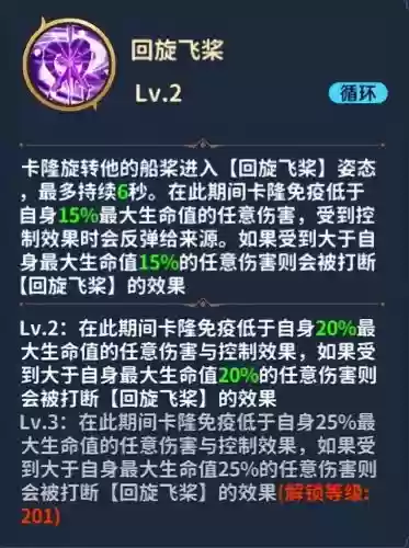 回旋飞桨是一个很有意思的技能,卡隆在后排时经常是空转3技能,有点呆若木鸡的感觉,既没有打人也没有被人打,免疫最大生命值的25%伤害这个数据比较重要,有兴趣的大佬可以测试下。