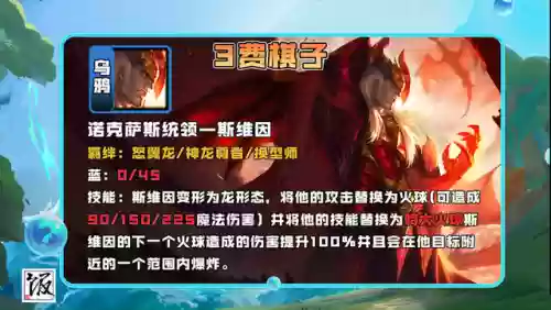 这套体系中乌鸦自身占怒翼、换形师、神龙尊者三个羁绊。可以获得三个强化,虽然是三费卡,但棋子强度要高于普通四费。