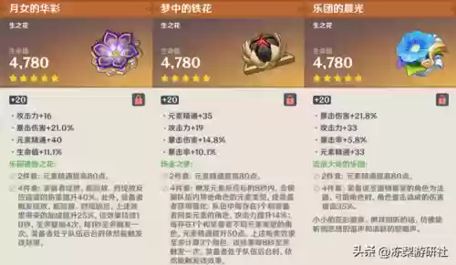 圣遗物可选如下:绽放伤害极值最高的乐园遗落之花、精通最高的饰金之梦、轻松摆烂的精通2+2。其中,精通杯是最难刷的,有时遇到4星圣遗物也可留一手。