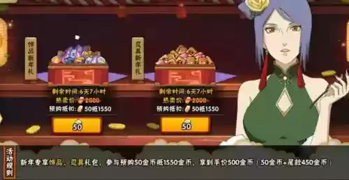本周花50金币预购,1月28日再花450金币就能买饰品和忍具素材。如果你不怎么喜欢提升战力,那可以直接忽略。如果对战力比较看重,这两个礼包都是必买的。