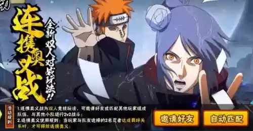 双人组队竞技,2v2的模式,和羁绊对战差不多。达成羁绊关系可以通过双人QTE释放连携奥义。还是值得一玩的。就是开放连携奥义的忍者有点少。只有5组。奖励方面同样分每日和总奖励,获取难度并不高。