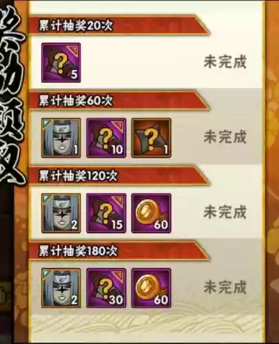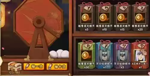 通过购买奖卷进行抽奖(100金一次),保底7000金,(一般都是5-6千金出,推荐单抽,有点玄学)。主要为抽取兑换币在商店兑换忍者。同级奖励忍者都是5888/40片的A级忍者。加藤断和三忍纲手同时集齐可以获得头像框奖励。