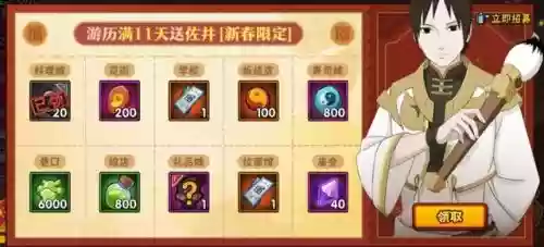 每日登陆领取三个饭团,投喂可以获得300经验。升级后可以游览地区获得奖励。累积11天就可以领取B忍新春佐井。