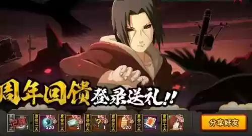 每日登陆即可领取奖励,今天的奖励是鼬的时装。明天588金币,然后是保护符、金忍具。