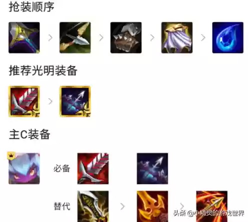 这套阵容以小炮为主C,所以小炮的装备非常关键。小炮第一件必备饮血剑,因为饮血剑可以提高小炮的续航能力;第二件最好是轻语,因为当前版本,骑士和铁甲还是比较多的,第三件可以是任意物理攻击装,杀人剑、巨人杀手等等,都是不错的选择,有光明泰坦的话也非常好用。