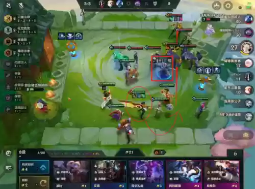下图这把熊熊就是针对狼狼人位置把莫甘娜调过去,避免狼人杀了布隆后直接突后排;但赛娜位置应该站在右二婕拉旁边,平A三星狼狼人后能直接放技能穿透到奎因。
