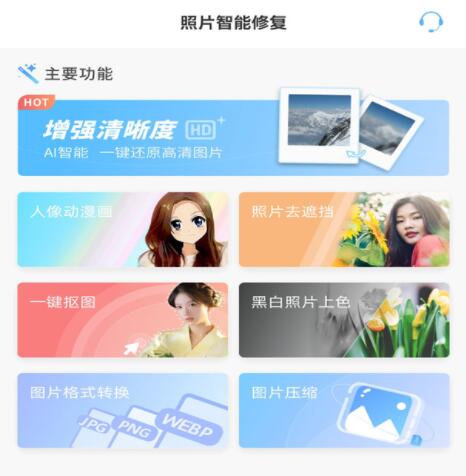 照片智能修复是基于领先的 AI 图像生成技术可在线照片增强软件,智能修复,立等可取。功能强大,15大功能模块(老照片修复、清晰度增强、去除遮挡物、一键抠图、图片格式转换、 AI 上色、拉伸修复、漫画脸、时光机、照片去雾、人像滤镜),满足你处理照片的各种需求。