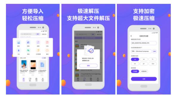 解压缩软件是一款强大的是一个集解压缩/压缩和文件管理于一身的小工具。可以一键解压zip、7z、rar等常用的几十种格式压缩包。支持解压与压缩、支持加密压缩、支持加密解压等功能。