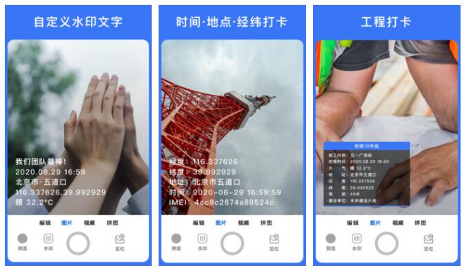 自定义水印相机,一般又称工作水印打卡相机app。水印打卡相机支持水印相机定位拍照、批量图片加今日水印、快拍水印相机,代替水印相机、今日水印相机、马克水印相机自定义定位、时间、水印、经纬度的自定义水印相机。水印打卡相机添加了工程相机、元道经纬相机功能,包括:工程水印、工程记录、经纬水印、工程信息、海拔、天气等。微商今日水印,自定义水印相机,工程相机水印统统都有!今日水印打卡水印相机统统满足你!