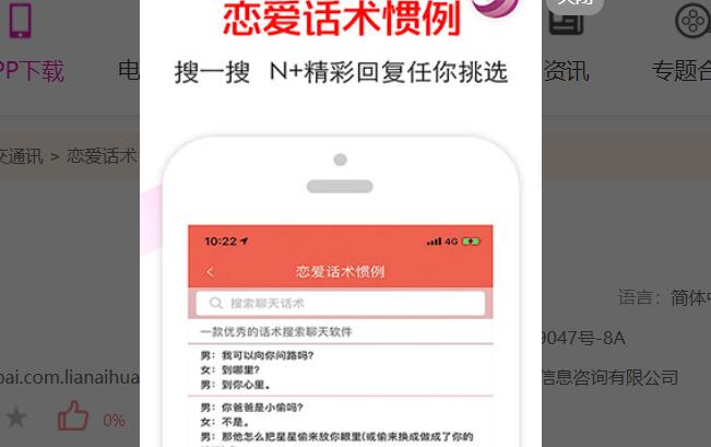 恋爱话术App是盐城和派商务信息咨询有限公司开发的一款恋爱话术应用助手。谈恋爱最重要的是谈,可是谈的时候我们会遇到各种各样的问题:和女生聊天没有话题?不知道怎么逗乐女生?女生生气了不会哄?不知道怎么让女生愿意跟你聊下去?不知道女生对你有没有意思?恋爱话术App可以帮你解决以上烦恼的,4W+话术库,遇到不知道怎么回复女生时,来这里搜一下,N+精彩回复供您选择,让您和女生聊天不再烦恼。
