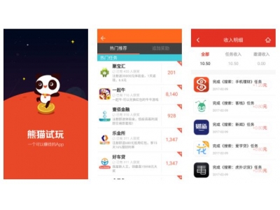 1、熊猫试玩 熊猫试玩,一款通过完成各种小任务来赚钱的app,让您可以利用您的零碎时间来赚钱。app内收集大量小任务,简单轻松,闲暇之余刷一刷,让...